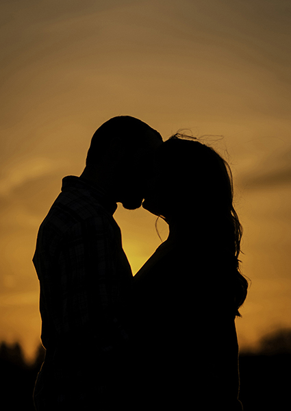 A couple kiss in front of a fiery sky on a chilly April evening.